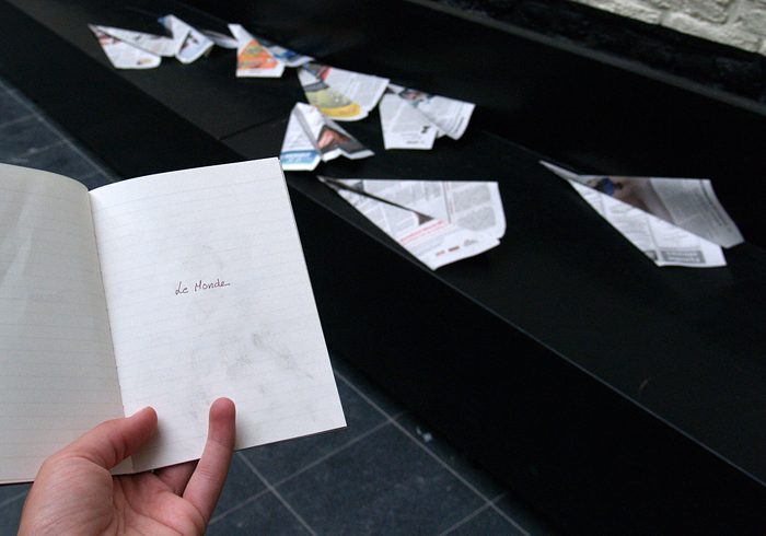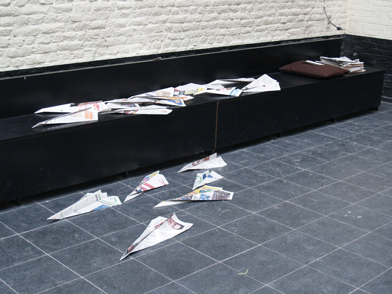 Confortavelmente sentada, dobro uma folha de jornal em forma de avião de papel. Lanço o avião no espaço e repito.