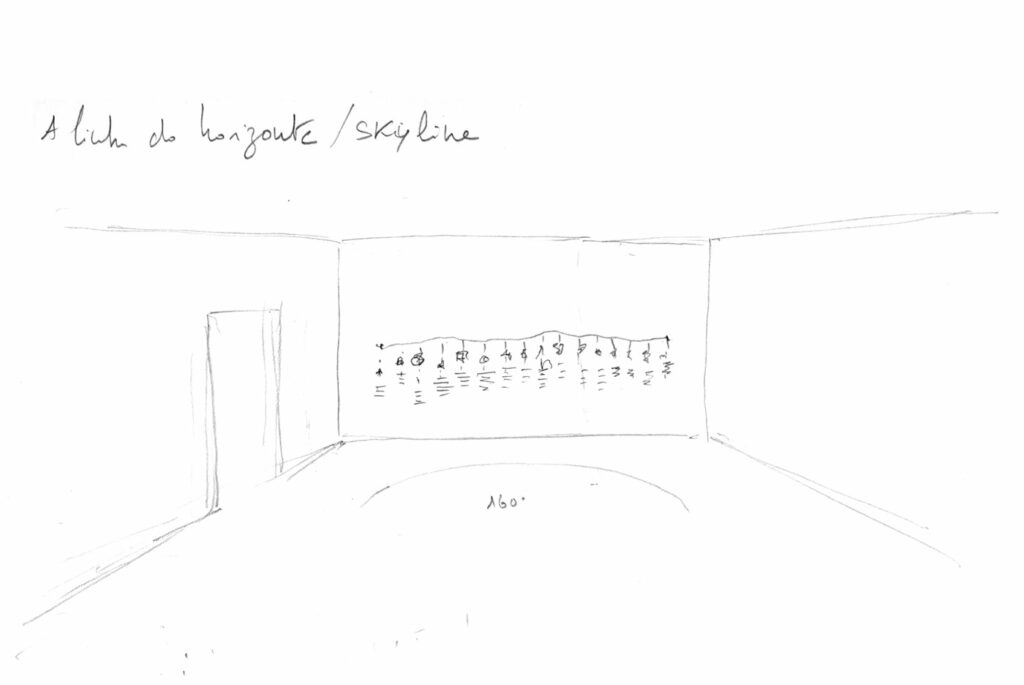 Desenho da linha do horizonte num ângulo de 160º vista do miradoro em frente ao Edifício de São Francisco, Chamusca.