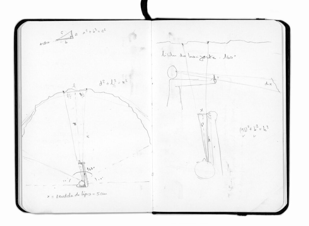 Definida uma dada medida do lápis, fui marcando pontos anódinos que encontrava na paisagem da vila da Chamusca, que serviriam como pontos de referência para desenhar com precisão os longínquos relevos da linha do horizonte.