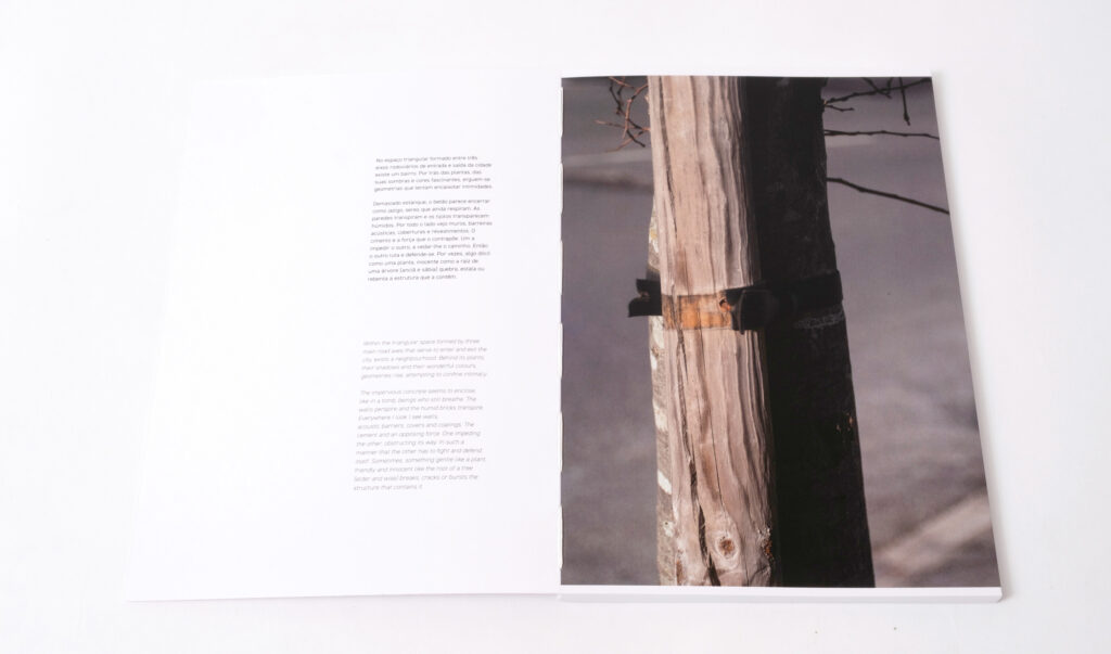 “Por trás das plantas, das suas sombras e cores fascinantes, erguem-se geometrias que tentam encaixotar intimidades. Demasiado estanque, o betão parece encerrar como jazigo, seres que ainda respiram. As paredes transpiram e os tijolos transparecem húmidos. Por todo o lado vejo muros, barreiras acústicas, coberturas e revestimentos. O cimento e a força que o contrapõe. Um a impedir o outro, a vedar-lhe o caminho. Então o outro luta e defende-se. Por vezes, algo dócil como uma planta, inocente como a raiz de uma árvore (anciã e sábia) quebra, estala ou rebenta a estrutura que a contém.”